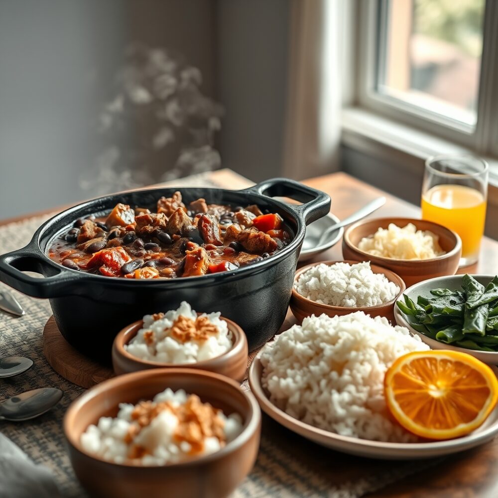 Sin entrar en una receta única —porque cambia según casa y región—, lo habitual es que llegue a la mesa con arroz blanco, farofa (harina de mandioca tostada), couve (col rizada salteada) y naranja en gajos para refrescar. Ese contraste es parte de la experiencia: grasa y sal, frente a crujiente, verde y cítrico.